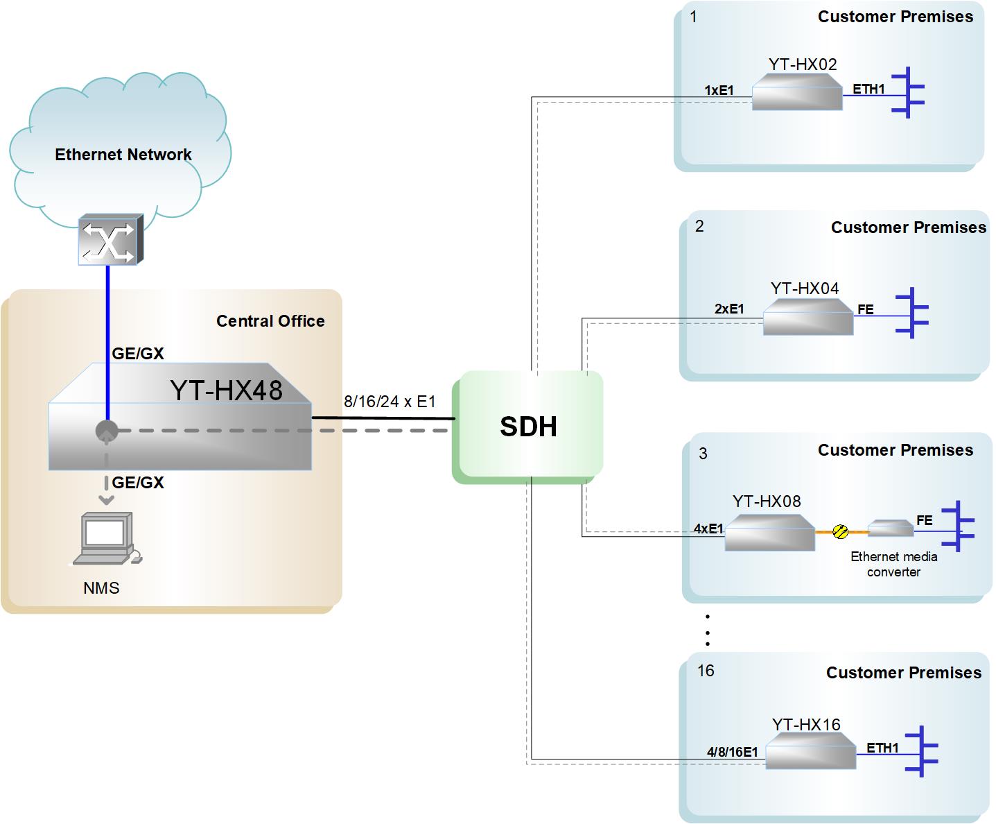 本設(shè)備可以部署在大中型客戶的總部機房,對客戶各分支點的業(yè)務(wù)進行匯聚,使總部和所有遠端分支點運行在于一個以太網(wǎng)2層交換平臺,為客戶提供總部和分支點的業(yè)務(wù)互聯(lián)。同時也可以部署在運營商機房,為客戶提供互聯(lián)網(wǎng)接入等業(yè)務(wù)。配合我司EOPDH遠端YT-HX02系列、YT-HX04系列、YT-HX08系列等設(shè)備,可為客戶提供完整的端到端多點匯聚解決方案。